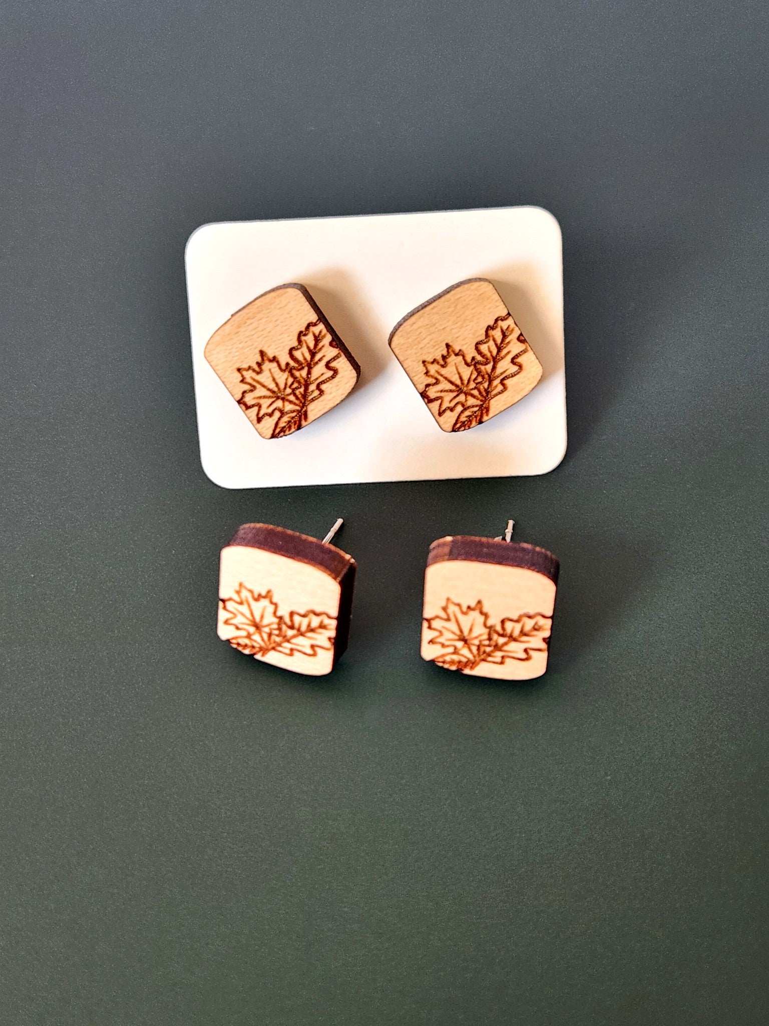 Fall Leaves Studs – Laser-engraved maple wood, handcrafted with love for a rustic, natural touch. Each measures approx. 0.4" – perfect for cozy sweater days.
