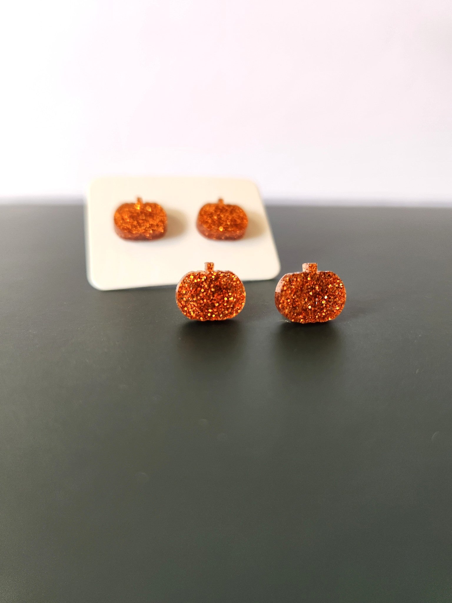 Glitter Pumpkin Studs – Sparkling orange acrylic pumpkins, designed and laser-cut by hand. Each measures approx. 0.45" – a playful nod to fall’s favorite icon!